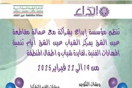بلاغ صحفي عن فعاليات أيام تنمية المهارات الفنية والثقافية للطفل التي نظمتها مؤسسة إبداع بشراكة مع عمالة عين الشق أيام 19 و22 فبراير