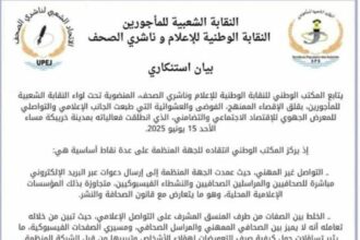 نددت النقابة الوطنية للإعلام وناشري الصحف، المنضوية تحت لواء النقابة الشعبية للماجورين، بما وصفته بالإقصاء المهني والفوضى التنظيمية التي شابت الجانب الإعلامي والتواصلي خلال