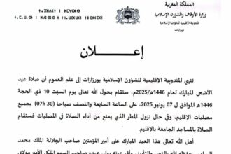 ورزازات. اعلان عيد الأضحى: صلاة العيد في تمام السابعة والنصف صباحًا.